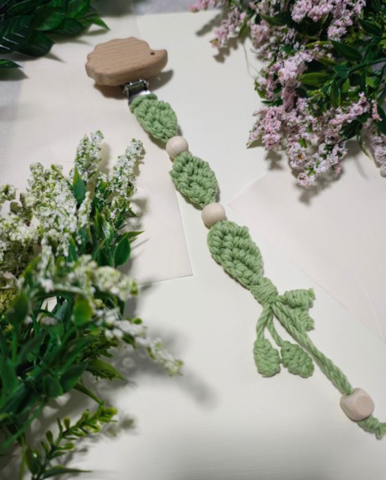 Wykonana techniką makramy ze sznurków bawełnianych z certyfikatem Standard 100 by OEKO-TEX w klasie I (co oznacza, że są bezpieczne i mogą być stosowane w produktach dla niemowląt i dzieci do lat 3) i klipsa z nielakierowanego drewna bukowego.