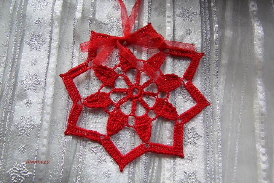 Zawieszka wykonana została z czerwonej bawełny. Średnica 14cm. Można ją wykorzystać do ozdobienia choinki, stroika światecznego lub okna.