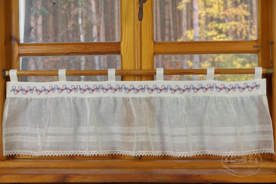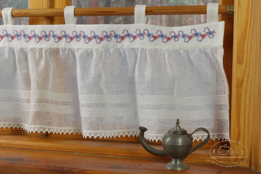 Delikatne batystowe zasłonki z kwiatowym haftem , zakończone małymi ząbkami, ujmują swoją lekkością a zarazem skutecznie zasłaniają łazienkowe okna. Zostały wykonane bardzo starannie. W sprawie wyboru tkaniny przydatne okazały się inicjatywa i porady wykonawcy.