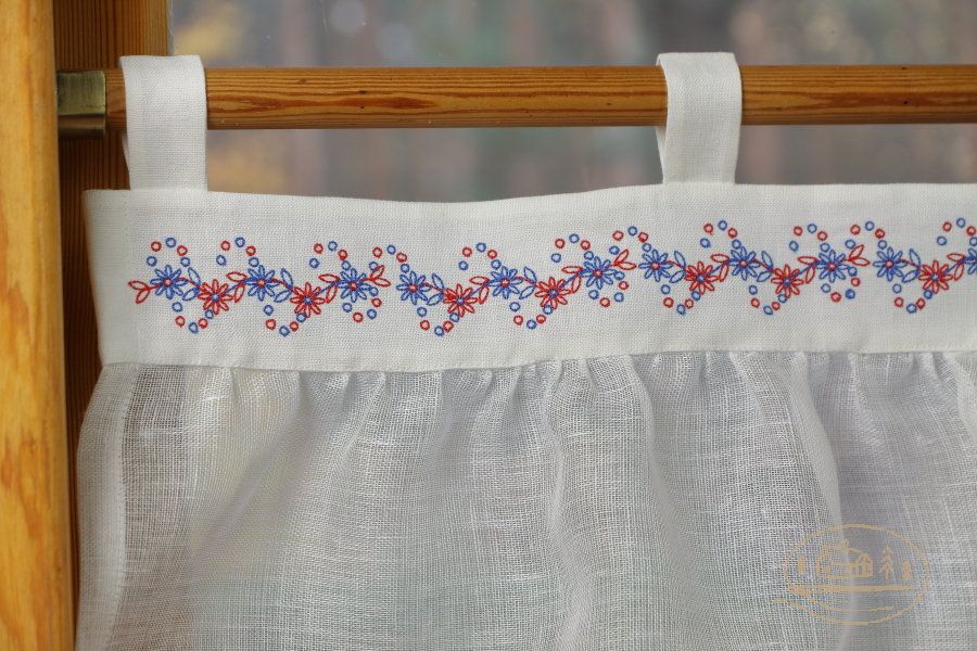 Zazdrostka uszyta jest z pięknej tkaniny lnianej. Listwa i szelki uszyte są z gęsto tkanej tkaniny lnianej w kolorze białym, natomiast dół zazdrostki uszyty jest z przezroczystej białej tkaniny lnianej, zwanej „lnianą mgłą”. Zazdrostka ozdobiona jest białą lnianą koronką brzegową oraz wstawką. Listwa zazdrostki ozdobiona jest czerwono-niebieskim haftem inspirowanym pięknym ludowym haftem rzeszowskim.