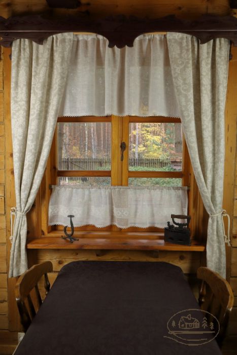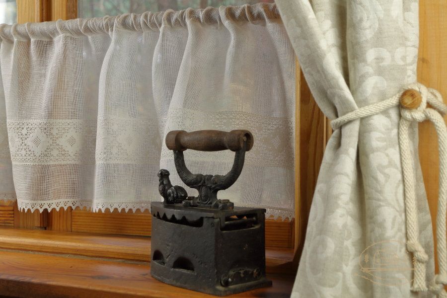 Komplet składa się z firanki i zazdrostki. Uszyty jest z pięknej przezroczystej mlecznobiałej tkaniny lnianej, zwanej „lnianą mgłą”.
