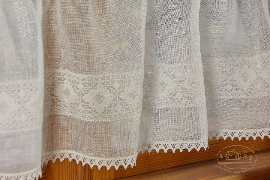 Dół firanki i zazdrostki ozdobiony jest lnianą koronką w kolorze mlecznobiałym. Zazdrostka dodatkowo ozdobiona jest szeroką lnianą koronką wstawką w kolorze mlecznobiałym.