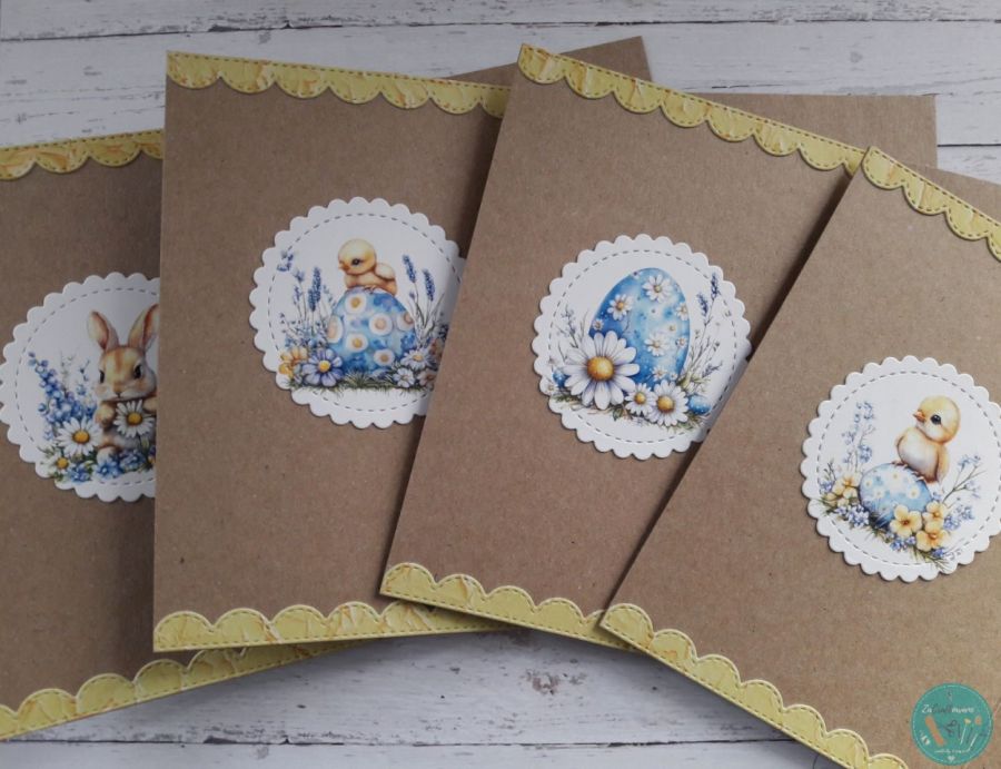 Zestaw 4 kartek wielkanocnych wykonanych metodą scrapbbokingu z wykorzystaniem profesjonalnych materiałów i z dbałością o każdy szczegół.