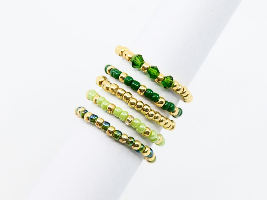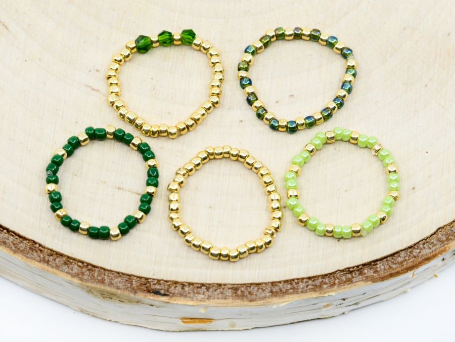 Bazę pierścionka stanowi mocna, przezroczysta gumka silikonowa, na nią nawleczone są wysokiej jakości drobne koraliki szklane.