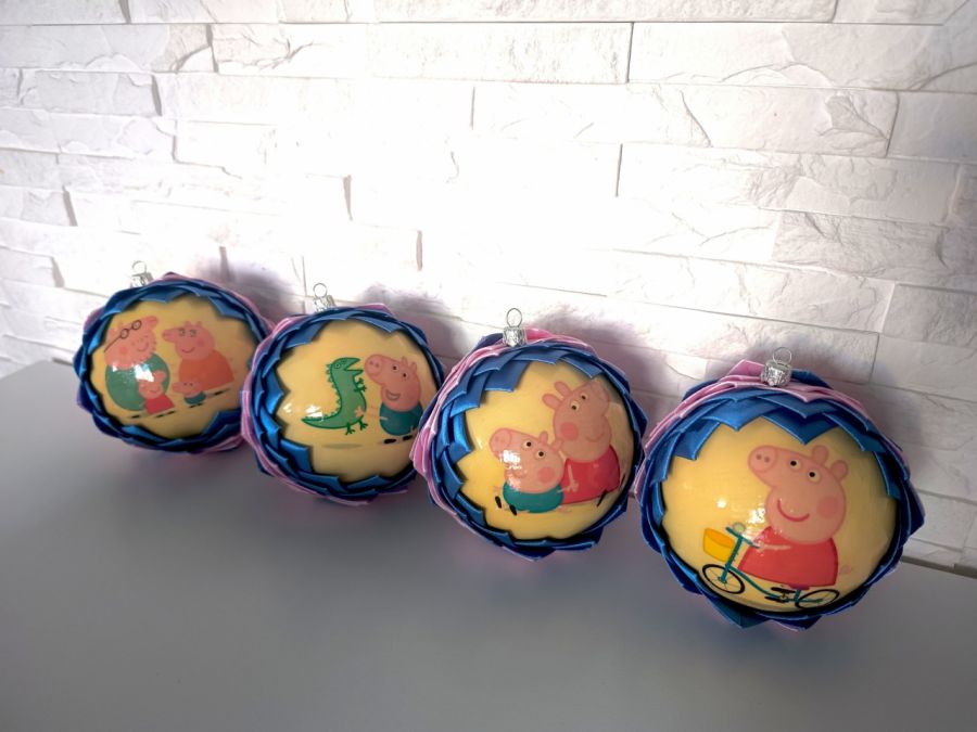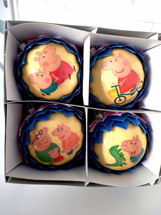 Zestaw 4 bombek styropianowych o średnicy 10cm z motywem ŚWINKA PEPPA w ozdobnym opakowaniu.