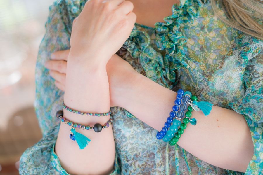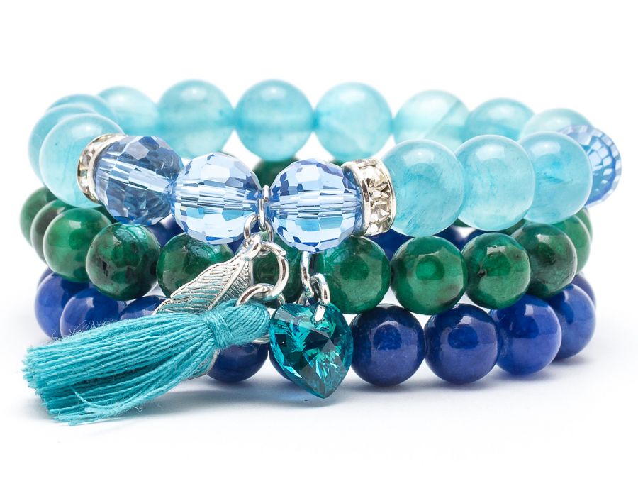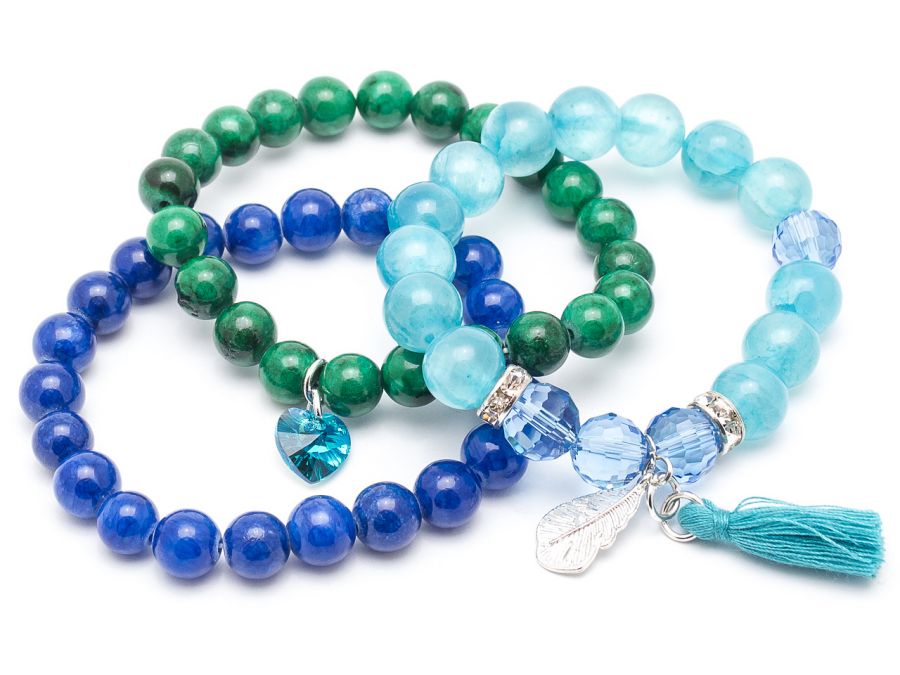 Komplet bransoletek z kamieni naturalnych, jadeit kobalt 8 mm, zielony 8 mm, lazurowy 10 mm, kryształy szklane 10 mm, zawieszka Swarovskiego, mały chwost ok. 2,5 cm.