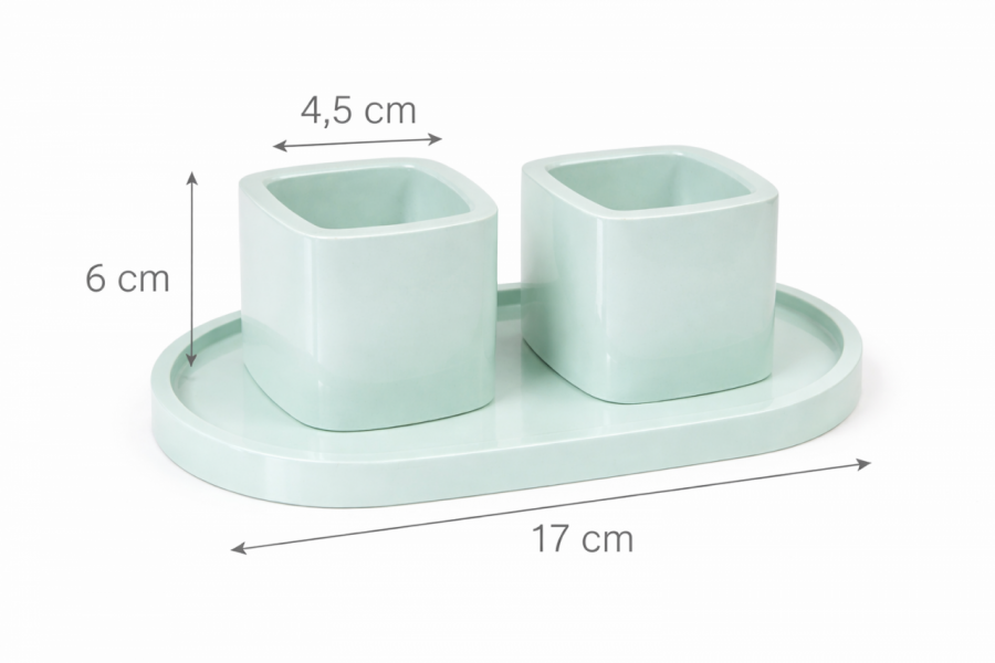 Wymiary: długość tacy 17 cm, wysokość świecznika 6 cm, średnica 4,5 cm.