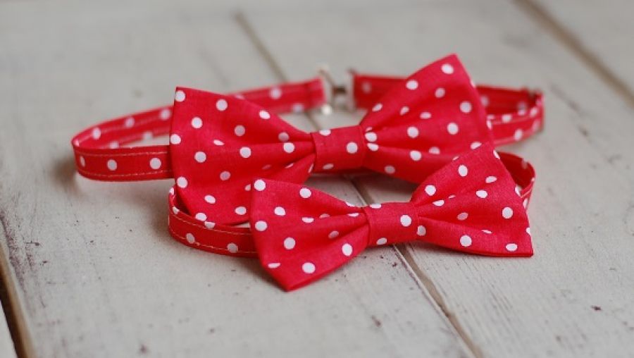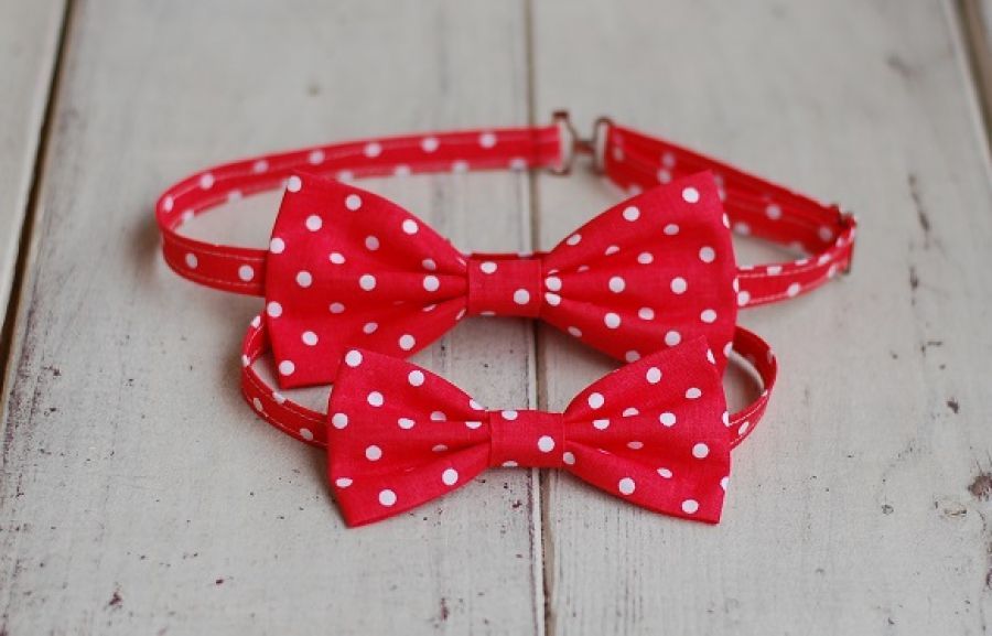 Tutaj oferowany jest zestaw dwóch much wykonanych z tej samej tkaniny - czerwonej bawełny w białe kropki.