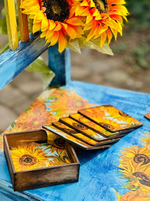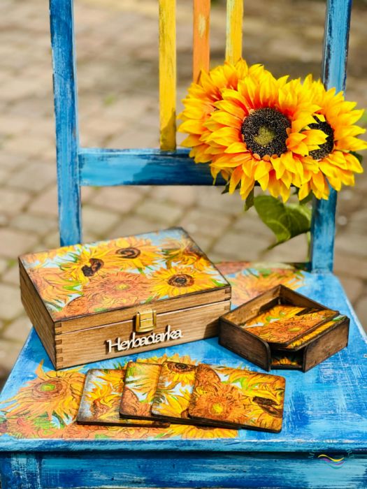 Nazwa produktu: Zestaw prezentowy ze słonecznikami, pudełko na herbatę i podkładki, sielskie