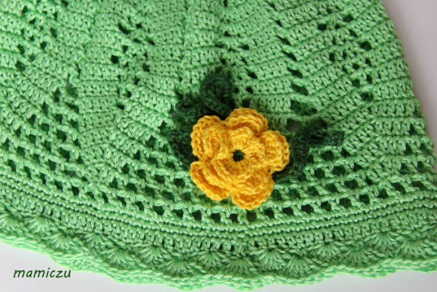 Wykonana jest ręcznie szydełkiem wzorem ażurkowym z włóczki bawełnianej. Ozdobiona szydełkowym kwiatkiem.
