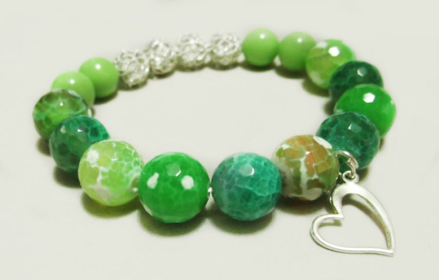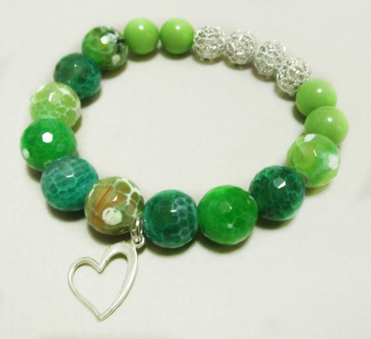 Autorska bransoletka ze starannie wyselekcjonowanych agatów fastetkowanych w obłędnych barwach zieleni, jadeitów soczystych (mniejsze, jednolicie zielone) i ażurowych korali ozdobionych maciupeńkimi cyrkoniami. Serduszko osładza całość.