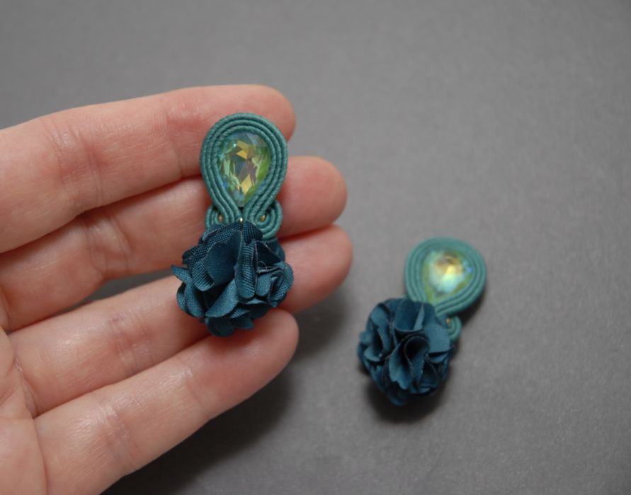 oferuję kolczyki lub klipsy zrobione haftem sutasz, ozdobione szklanymi kaboszonami, kwiatkami z materiału i drobnymi koralikami