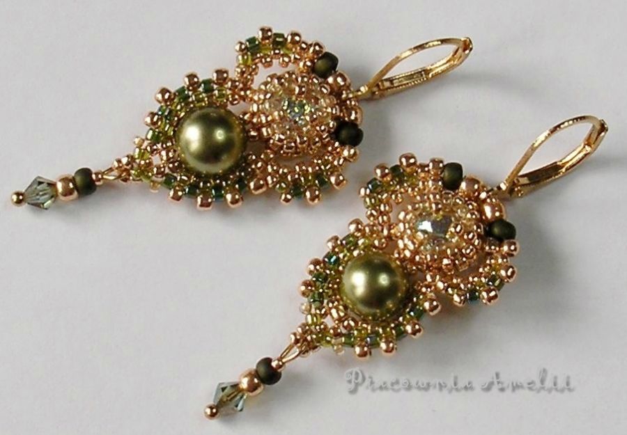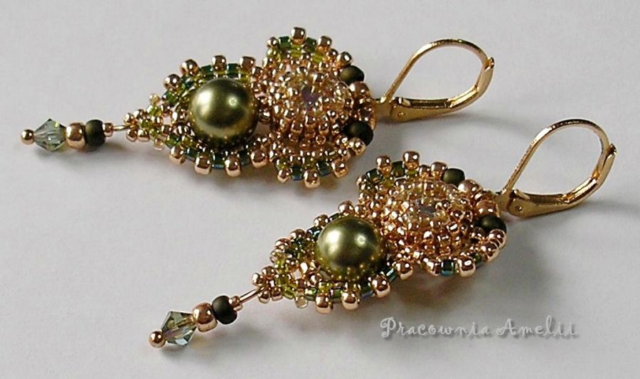 Kolczyki na biglach angielskich, wykonane z galwanizowanych japońskich koralików Toho w kolorze różowego złota, koralików Toho i Miyuki w odcieniach zieleni, kryształków bicone i szklanych koralików Honeycomb Jewels. Główny element ozdobny stanowią perły Seashell w kolorze oliwkowej zieleni.