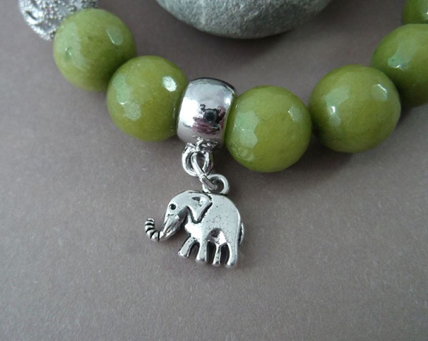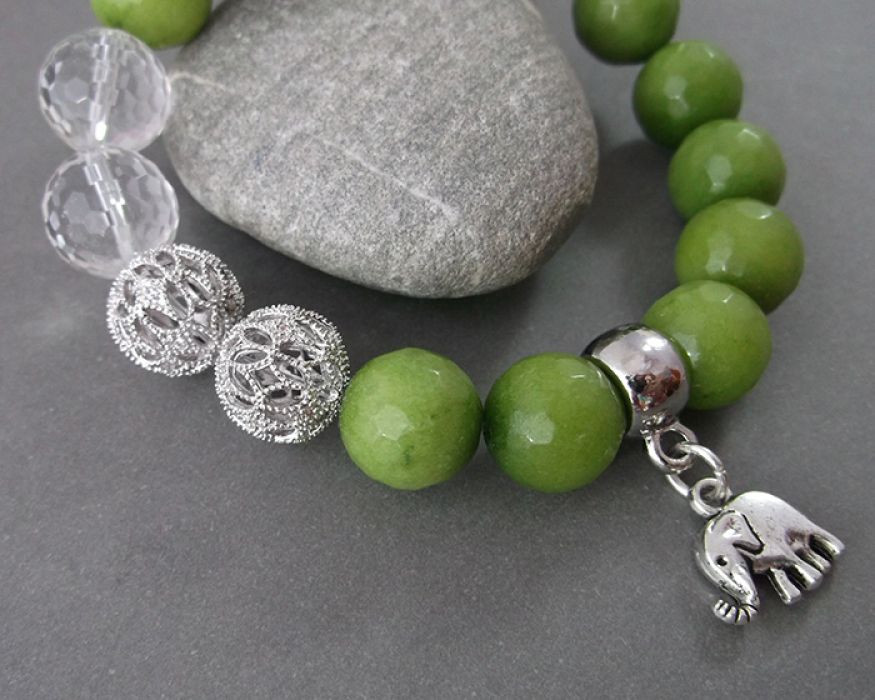 Bransoletka z kamieni naturalnych. Jadeity fasetkowane mają kolor jasnej, oliwkowej zieleni. Kryształ górski jest świetnej jakości. Dodatkową ozdobą są ażurowe korale z metalu w kolorze srebrnym, ozdobione maluteńkimi cyrkoniami, które nie są prawie widoczne, a jedynie odbijają światło (iskierki). Zawieszka jest dwustronna: słonik na szczęście.