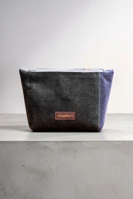 Duża kosmetyczka w kolorze zielono-szarym. Stworzona w duchu no waste.