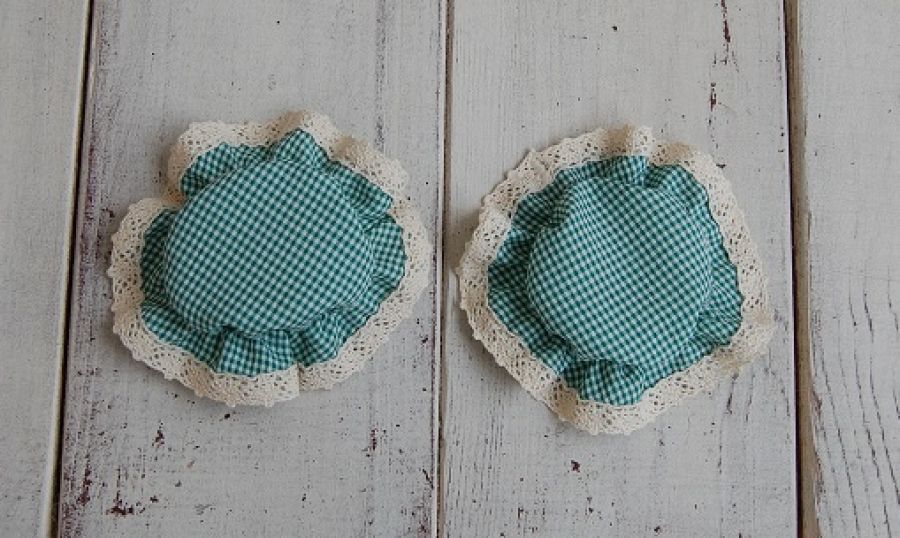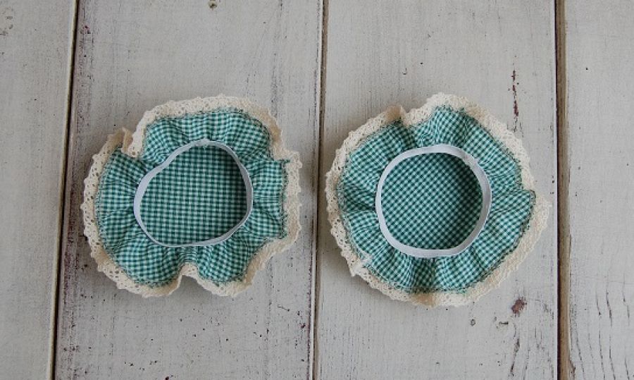 Dekoracyjne kapturki na słoiki z przetworami. Uszyte z tkaniny w zieloną, drobną krateczkę, dookoła wykończone koronką bawełnianą. Od lewej strony wszyta gumka - ułatwiająca zdejmowanie i wkładanie kapturka na słoik. Pasują na zakrętkę o średnicy 5,5/6,5cm.