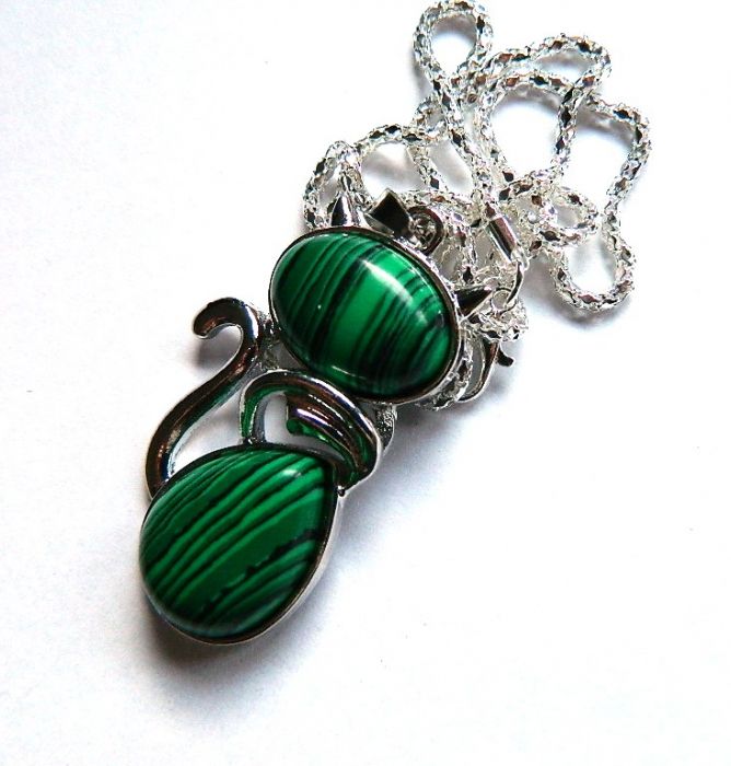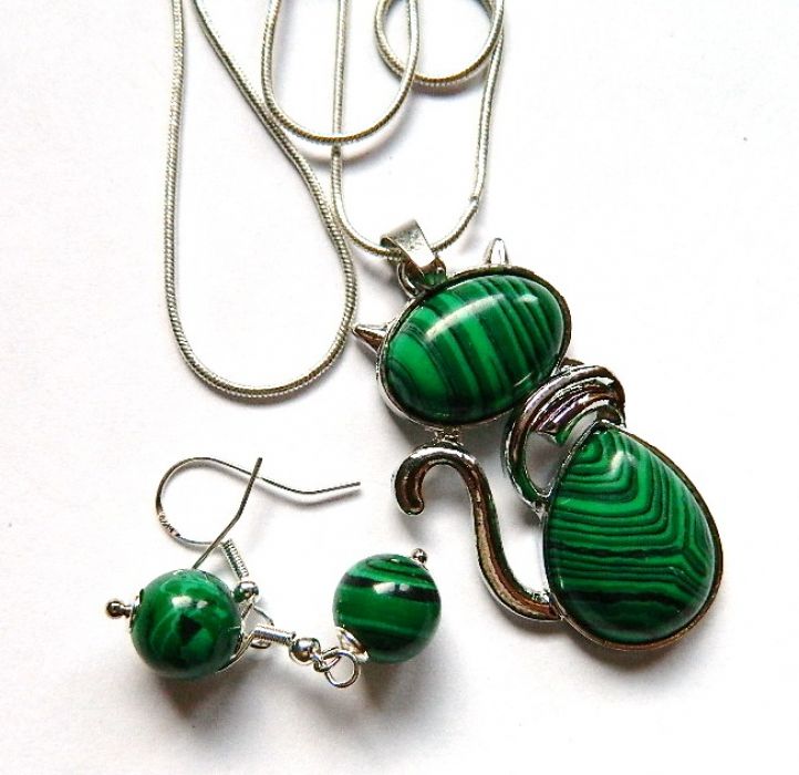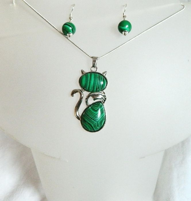 Nazwa produktu: Zielony malachit, wisiorek z kotkiem i kolczyki