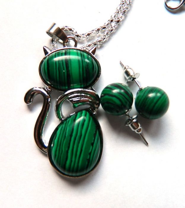 Zadaj pytanie dotyczące produktu: Zielony malachit, wisiorek z kotkiem i kolczyki sztyfty, komplet biżuterii