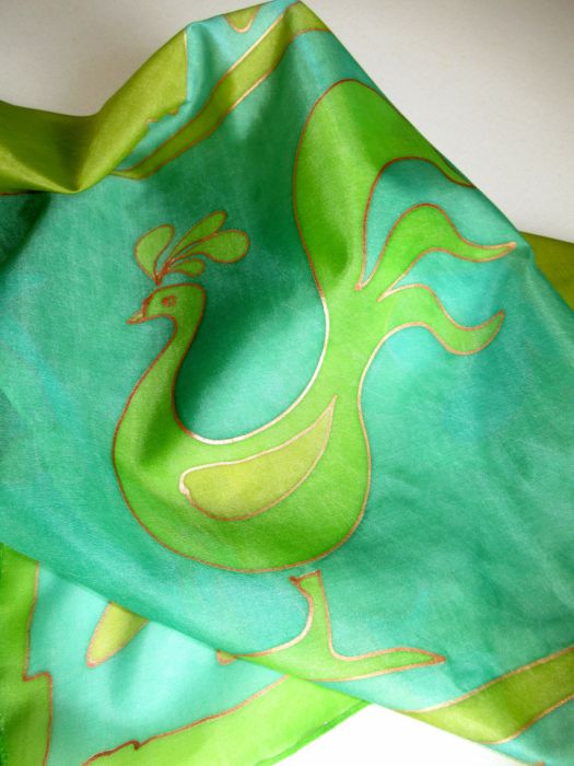 Ręcznie malowana chusta z naturalnego jedwabiu Zielony Ptak.