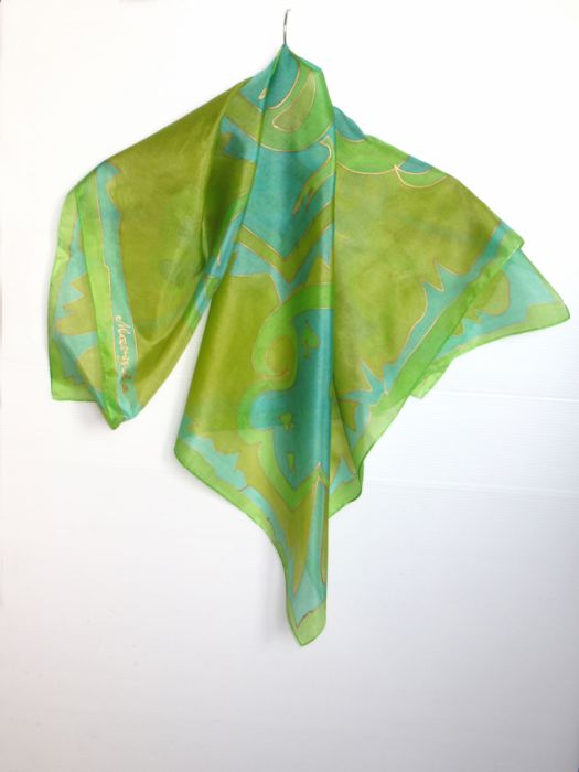 Artystyczna jedwabna apaszka w odcieniach zieleni. Chusta jest elegancka. Dobrze pasuje do marynarki, bluzki, sukni. Nadaje się na mniejsze i większe okazje.