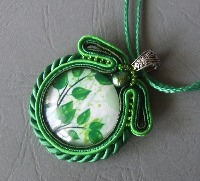 Duży, autorski wisior ze szklanym kaboszonem, naturalną perłą i małymi koralikami. Gratis dodaję sznureczek zielony do powieszenia. Pakuję w pudełeczko jubilerskie. Polecam!