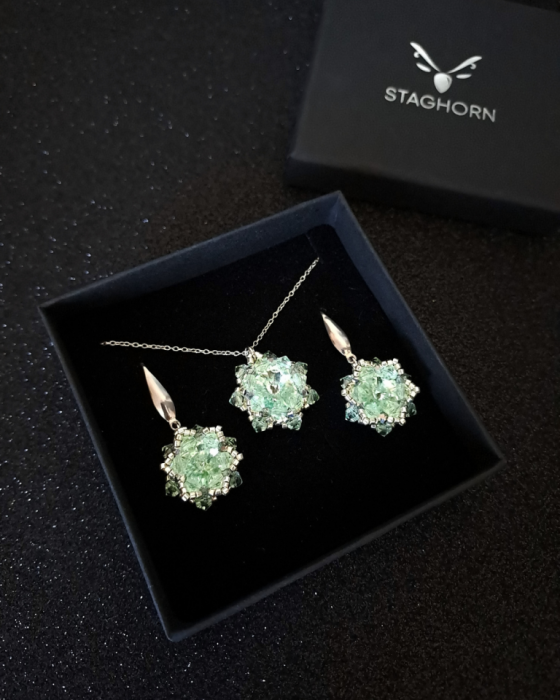 Zestaw Biżuterii Chrysolite jest jak oddech lasu zamknięty w biżuterii. Zielone refleksy kamieni Preciosa Rivoli Maxima w odcieniu chrysolite lśnią jak poranna rosa na liściach - subtelnie, ale z mocą. Otulone migotliwymi kryształkami i koralikami, tworzą spójną, hipnotyzującą całość. Dla kobiety, która chce nosić ze sobą ciszę natury i siłę światła. Ten zestaw to harmonia w czystej postaci. Noszone razem, kolczyki i naszyjnik tworzą olśniewający duet, który dopełni stylizacje romantyczne, codzienne i wieczorowe. Z osobna - dodadzą delikatnego blasku i świeżości. To biżuteria dla kobiet, które łączą siłę z delikatnością, elegancję z intuicją, modę z naturą.