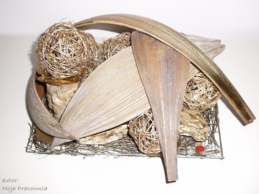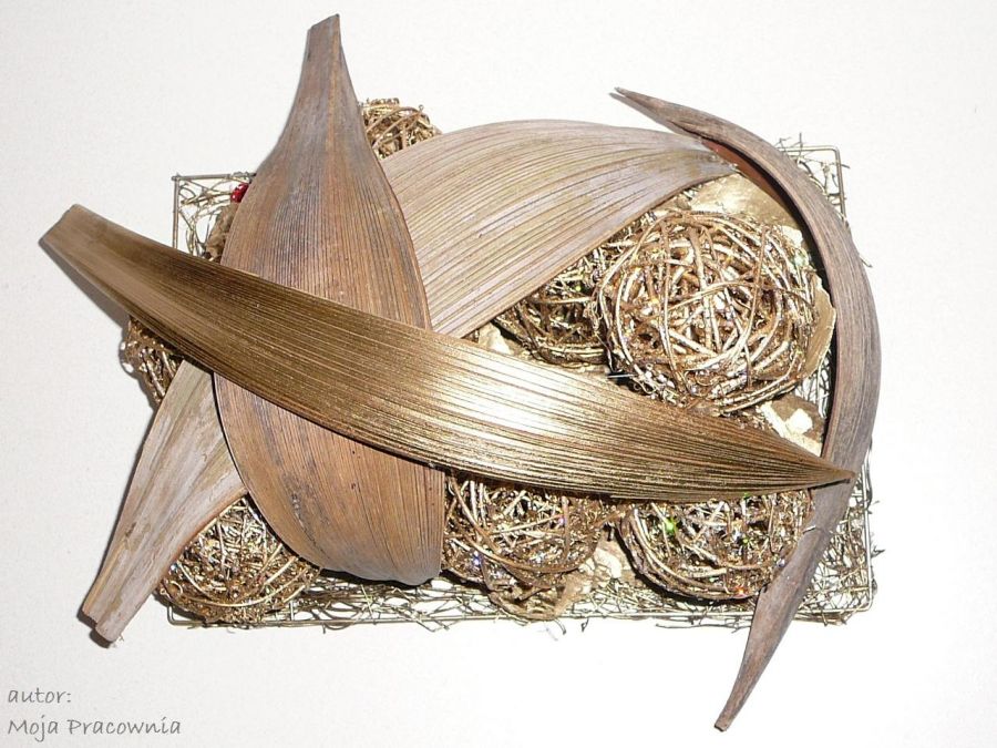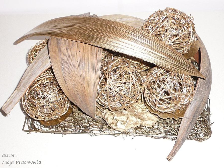 Złota dekoracja z kulami z wikliny. Do postawienia na stół, meble itd.