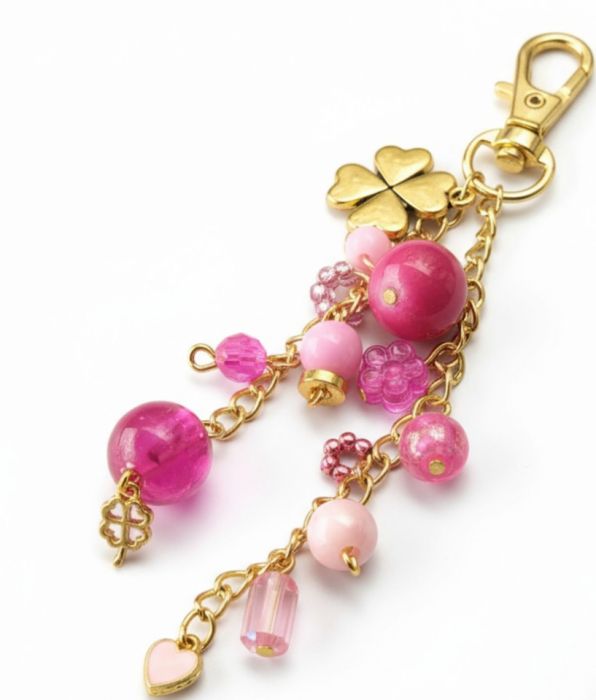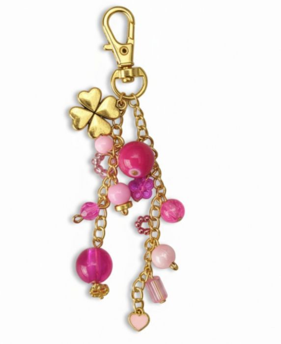 Różowo złoty breloczek z koniczynką do plecaka, kluczy lub torebki