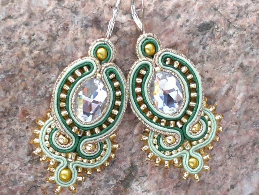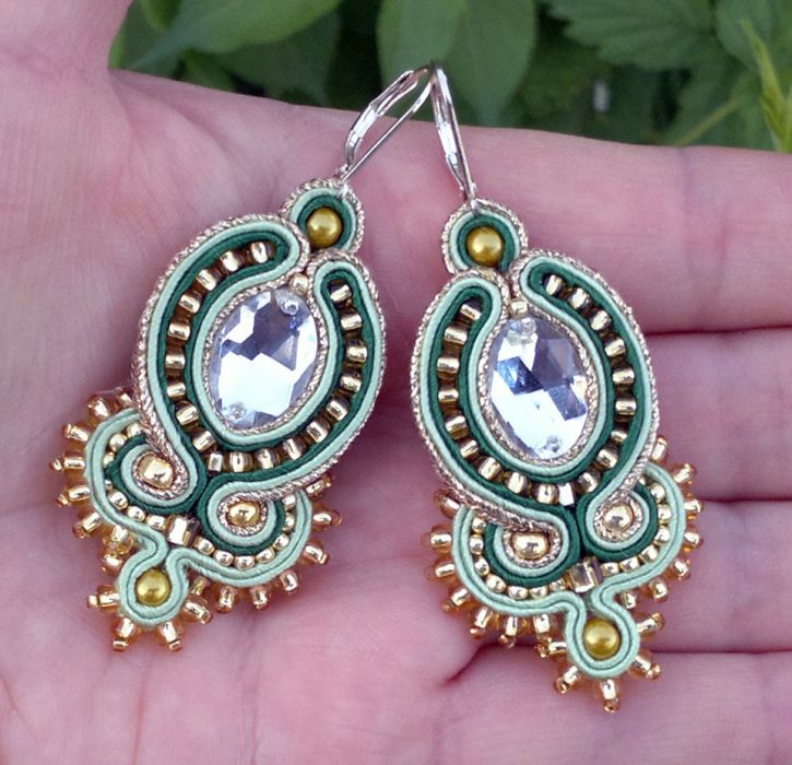 Centrum pięknych kolczyków jest przezroczysto-srebrny kryształ którego otulają sznurki sutasz w odcieniach zielonym, jaśminowym, złotym metalizowanym i złote koraliki TOHO. Bardzo ładne prezentują się na uchu! Złote koraliki dają im szyku.