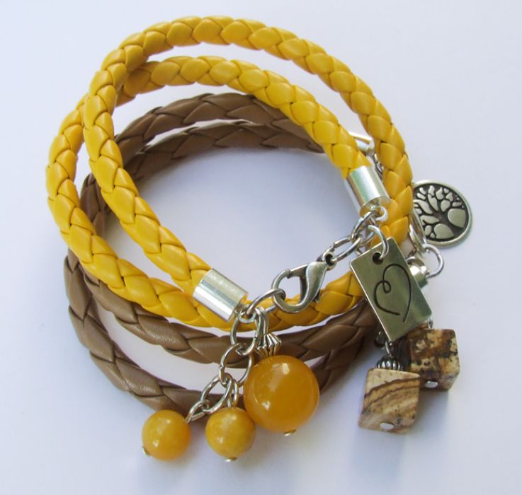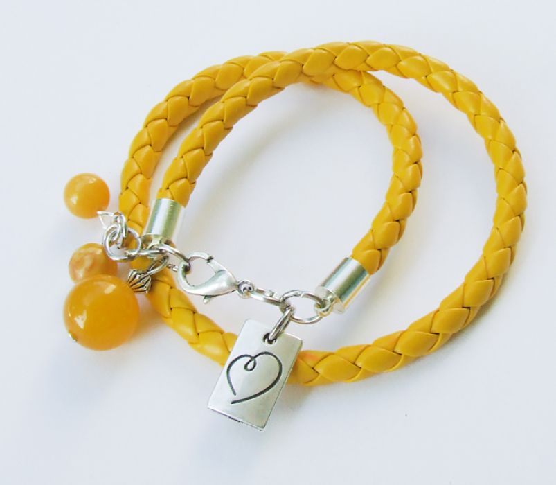 Podwójna, gruba, miękka bransoletka upleciona z żółta rzemienia (skórka syntetyczna), ozdobiona podwójną, bardzo ładną zawieszką FALL IN LOVE (z serduszkiem) i jadeitem i agatem. POLECAM! Na nadgarstek od 15 cm do 17 cm.