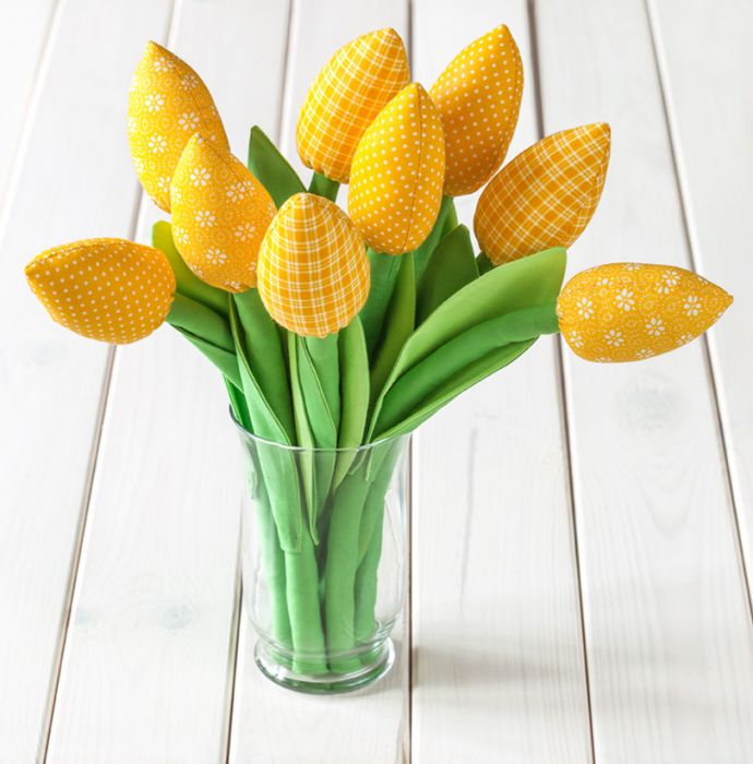 Bukiet bawełnianych, miękkich, nie więdnących tulipanów. 9 kwiatów w kolorze żółtym (wzór: kropki, kwiatki, kratka). Liście tulipanów dwustronne/dwukolorowe. Wielkość pojedynczego kwiatka to ok 32-35 cm.