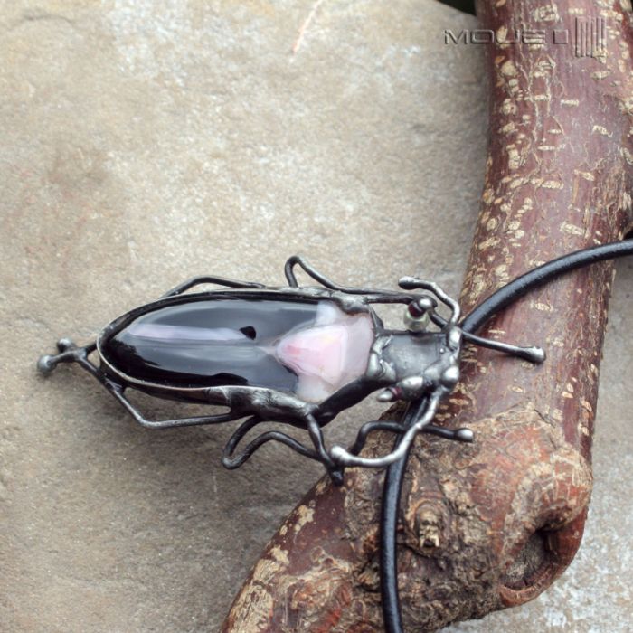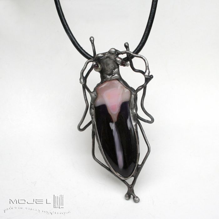 Różowo-śliwkowy żuk - wisior wytopiłam z nieprzejrzystego szkła w temperaturze kilkuset stopni metodą fusingu.