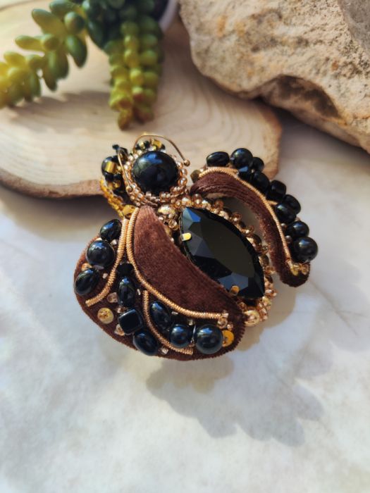 Stal, Tkanina, Akryl,Broszka została wykonana z miękkiego aksamitu i ozdobiona precyzyjnym haftem, czeskim koralikiem, kryształkami oraz lekkimi piórami, które nadają jej wyjątkowej lekkości i finezji. Tył broszki wykończony jest ekologiczną skórą, a solidne zapięcie gwarantuje wygodę i bezpieczeństwo noszenia.