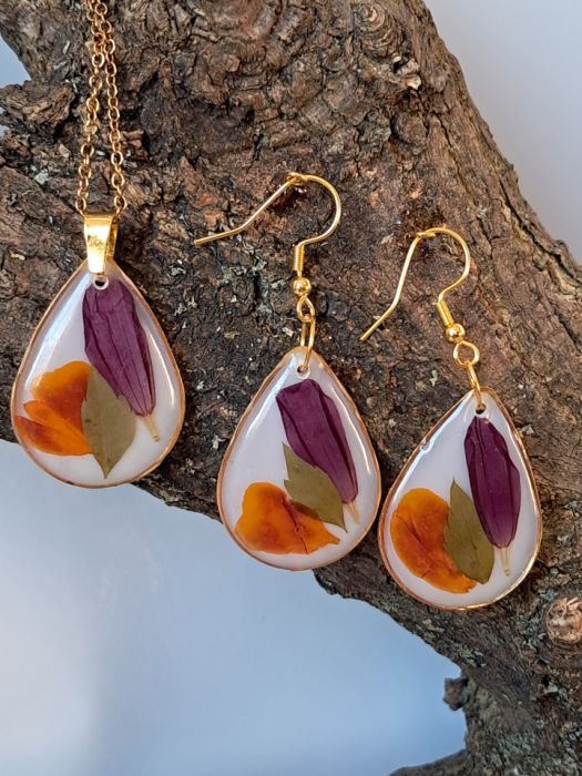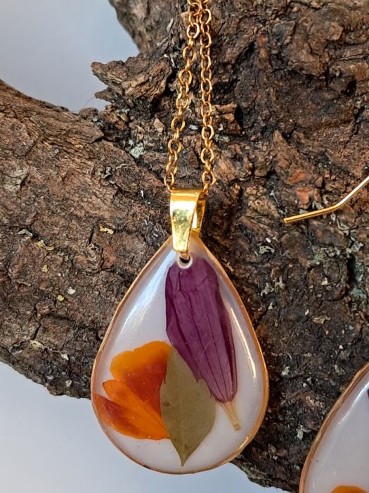 Komplet biżuterii wykonanej ze stali nierdzewnej w kolorze złotytm z zatopionymi w żywicy kwiatami. W skład kompoletuu wchodz zawieszka na łańcuszku i kolczuki około 3,5cm wysokośći.